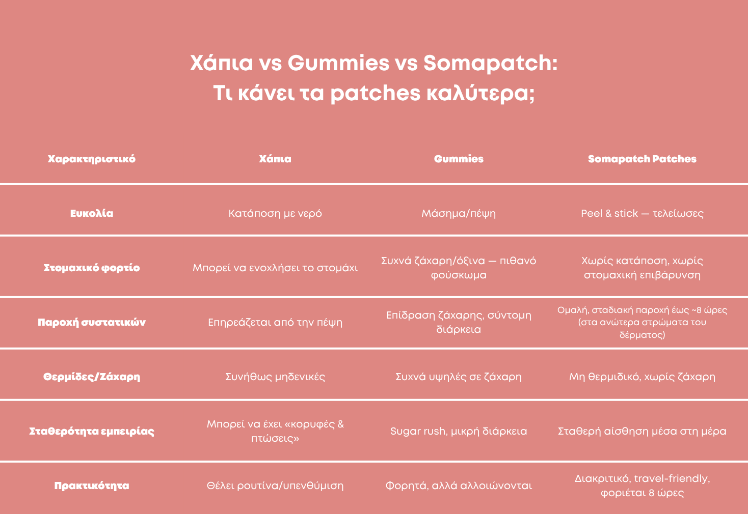 Τα Somapatch χρησιμοποιούν παροχή μέσω δέρματος: τα συστατικά δίνονται σταδιακά στα ανώτερα στρώματα της επιδερμίδας, ώρα με την ώρα — χωρίς κατάποση και χωρίς στομαχική επιβάρυνση.